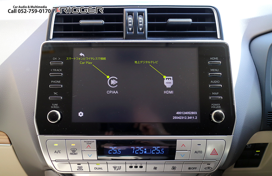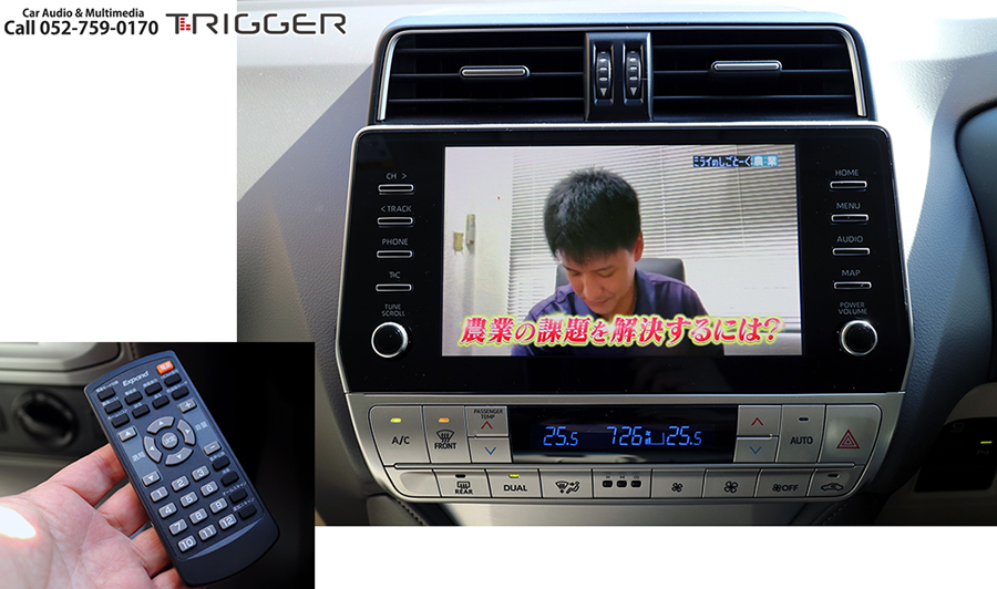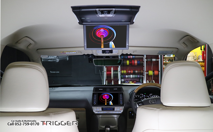 ランドクルーザー・プラドにルーフ用のフリップダウンモニターを付けたくても既製の取付キットがなく諦めている方へ! トリガーではオリジナル加工で対応可能です! ほとんどのサイズ・各メーカー製に対応 今回はアルパイン製 RSH10XS-R-B 10.1型を選んでいます モニターに表示できるメディア・ソースはオーナー様の希望により様々ですが今回は後部席で「地デジ」が観たいということで後部席専用地デジチューナーを増設して楽しめるようにします。 地デジチューナーは高感度のフルセグタイプ 全局した映像は運転席モニターと後部席モニター双方に表示します 後部席では常時、地デジが表示されますが運転席メインモニターに表示する場合は画面右の「HDMI」をタッチ。 副産機能として左に表示されたマークをタッチするとお使いのスマートフォンがワイヤレスでCarPlay表示します、便利ですね! 地デジ表示中 ランドクルーザーにモニターを取付希望の方、お気軽にお問合せください。