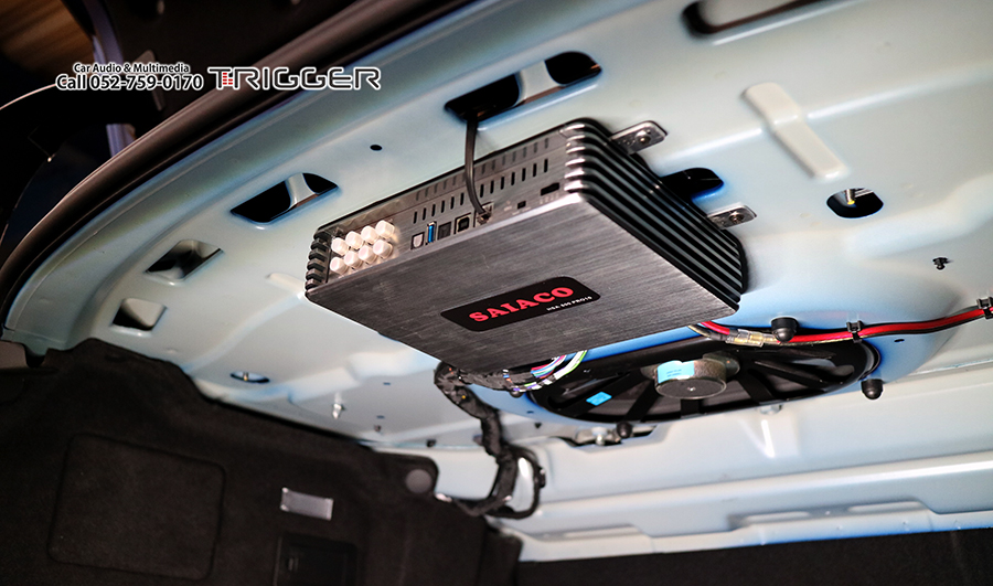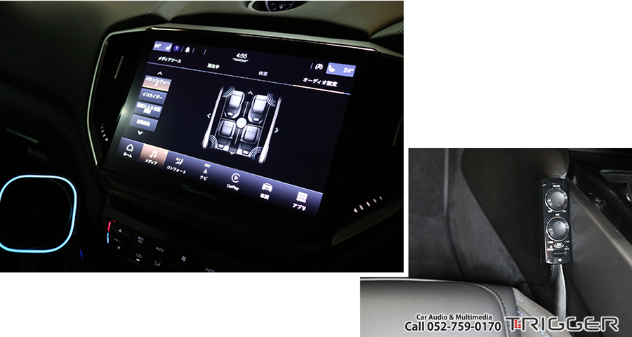 マセラティ ギブリの純正サウンドシステム 低域が少なく全体的な音質に不満とのことで提案したのは「DSPアンプで音のバランスを整える」です。 スピーカーは純正のまま使用して、SIACO 8ch-DSPアンプ TR-DSP800 PRO 10 を追加しました。 ギブリの場合はアンプ取付スペースはトレイ部に吊り下げするほかありません 任意で低域量を調整可能なコマンダー(※オプション)も取付 キャリブレーションを行い、純正のアンバランスな音をフラット化→再調整により音質をアップさせながら理想のミッドバスを生み出します。 完全バランス化されたサウンドは今まで聴いていいた曲は新しくなったように感じることでしょう。 マセラティの音質に不満を感じたらトリガーにご相談ください。