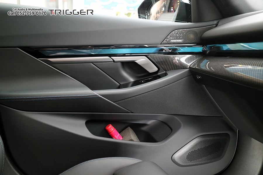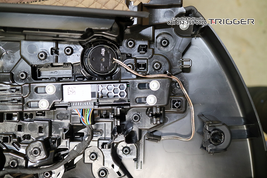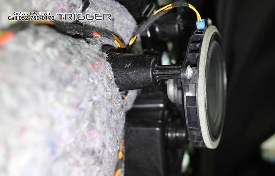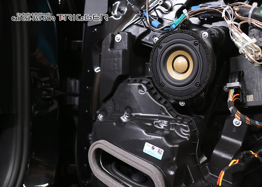 いままで全てのモデルがウーファーをシート下に設置していましたが、今回からドアに専用エンクロージャーに収さめた状態で設置されています。このウーファードライバーは専用形状・サイズなので市販に交換するのは専用品が発売されない限り無理な感じです。