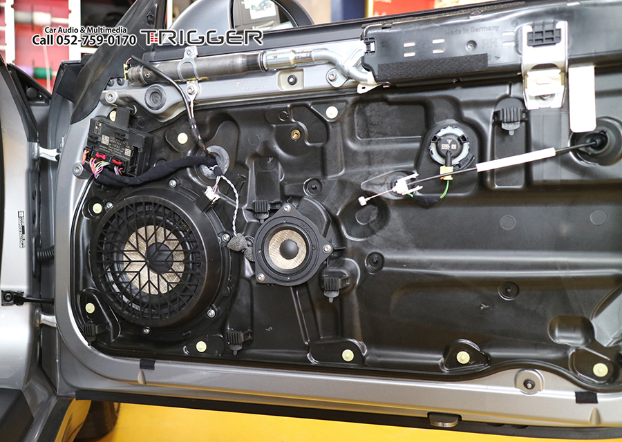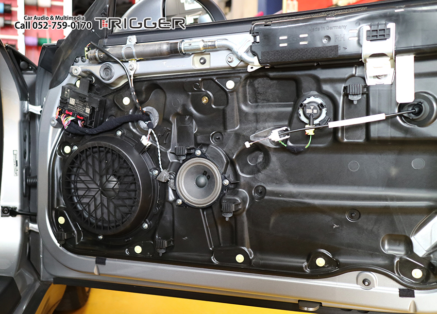 いい音で聴きたいならお薦めしたい3wayコンポーネントスピーカー FOCAL PS-165F3E ポルシェのドア&ダッシュで構成する3wayサイズにピッタリサイズで手軽に高音質化が可能です。 ドアトリム内、ミッドレンジとローレンジを取付ます 純正スピーカー FOCAL PS 165 F3E 3wayスピーカーのミッドレンジとローレンジへ交換しました。 インナーバッフルはTRIGGERオリジナル設計を使用 ハイレンジ(ツイーター)はダッシュ純正部へ取付完了 ツイーターからシート下パッシブネットワークまでは専用スピーカー線を入線しています。 助手席シートした(純正パワーアンプ設置場所)に専用パッシブネットワークを取付 全スピーカーの位相チェックした後、固定・シートを元に戻して完了 解像度アップ・中低域の大幅改善・広がり全てが軽量化された純正スピーカーとは比較にならない異次元の変化です。 ナビゲーションのもつ様々なエフェクト機能で完全なバランスに調整して完成となります!